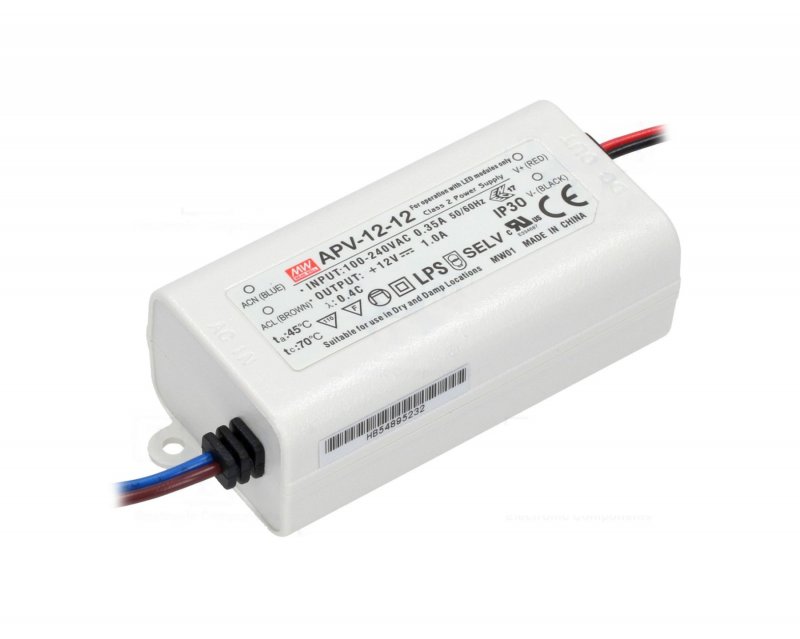 Druh zdroje: AC/DC Provedení: Zdroje pro LED Série: APV Vstup: 90~264V AC, 127~370V DC Výstup: 24V 0~0,5A Výkon: 12W Rozměry: 77x40x29mm