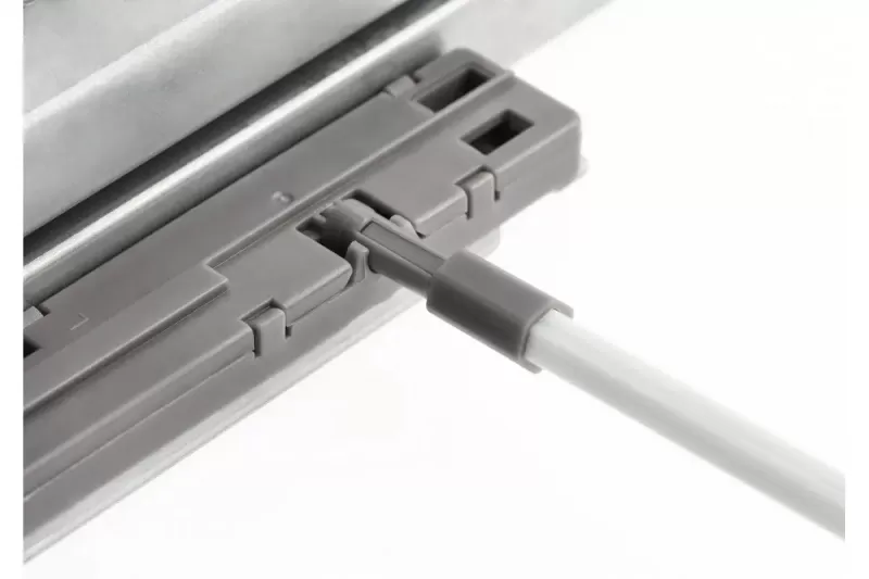 Synchronizační lišta pro zásuvku AXIS Pro. Použití synchronizace systému Push-to-Open umožňuje rozšíření obou snímků současně. Dotykem kdekoli na přední straně synchronizujete horizontální pohyb obou vodítek. Příčku lze zkrátit na příslušnou délku.