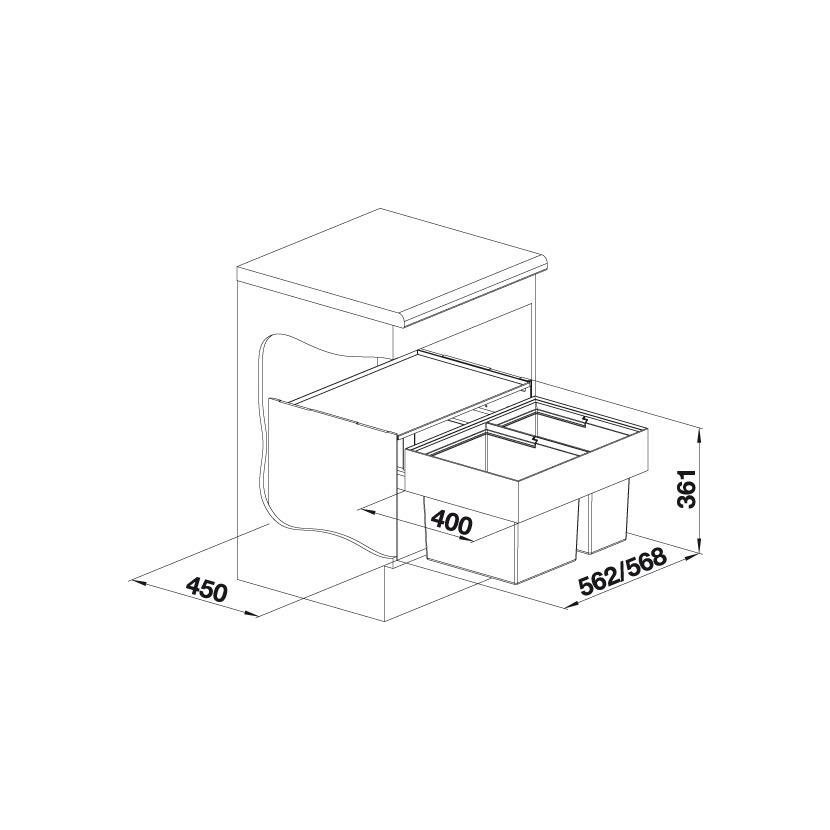 • Při plánování respektujte výšku montáže košového systému, hloubku dřezu a z toho vyplývající minimální rozměr spodní skříňky, tak aby bylo možné mezi koš a dno dřezu umístit odpadovou armaturu dřezu a rovněž tak hloubku skříňky směrem ke stěně, tak aby bylo možné dokončit montáž odpadové armatury se zápachovým sifonem za košovým systémem do odpadového otvoru.