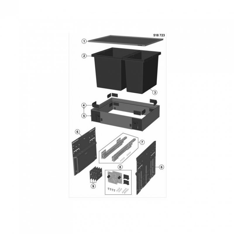rám s plným výsuvem a krytem, plastové nádoby a montážní příslušenství.