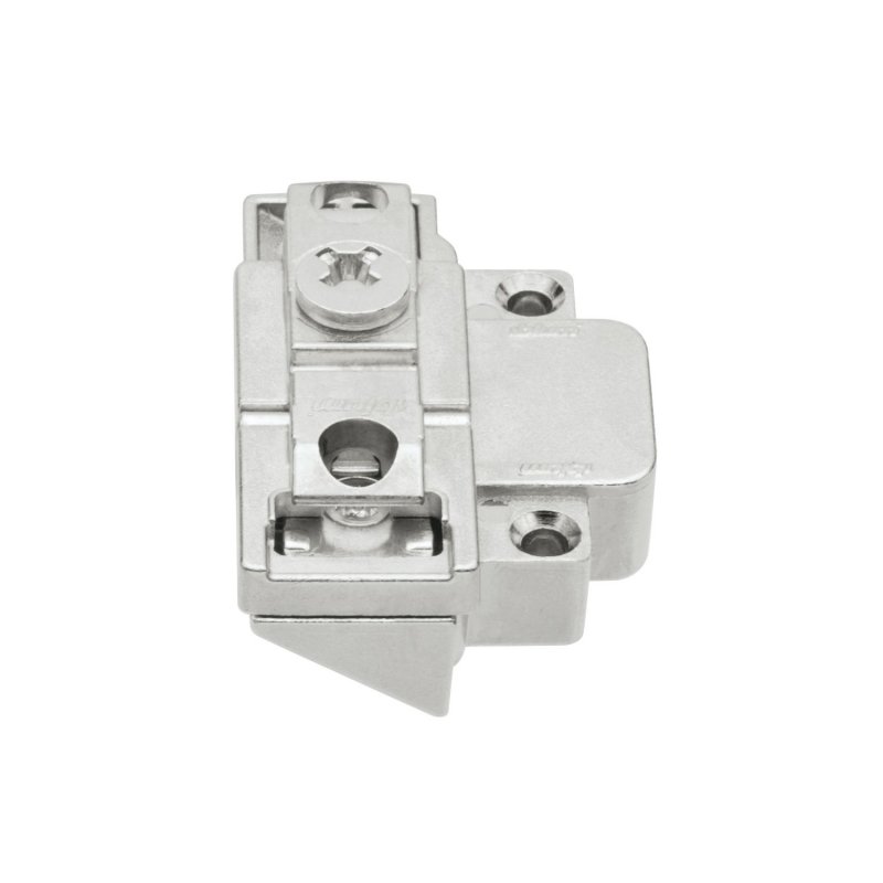 BLUM CLIP 175H5B00 adaptér pro teleskop a úzký alu rámeček, pravý Typ: AVENTOS HF Výrobní číslo: 175H5B00 Použití: úzký alurámeček Směr: pravý Výška (mm): 8,5 Zvýšení (mm): 0 Způsob montáže: hliník. šrouby Výškové nastavení (mm): +/- 2 Materiál: zinek poniklovaný