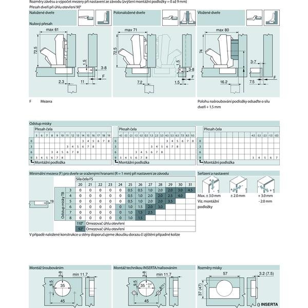 Použití: závěs s velkým úhlem otevření