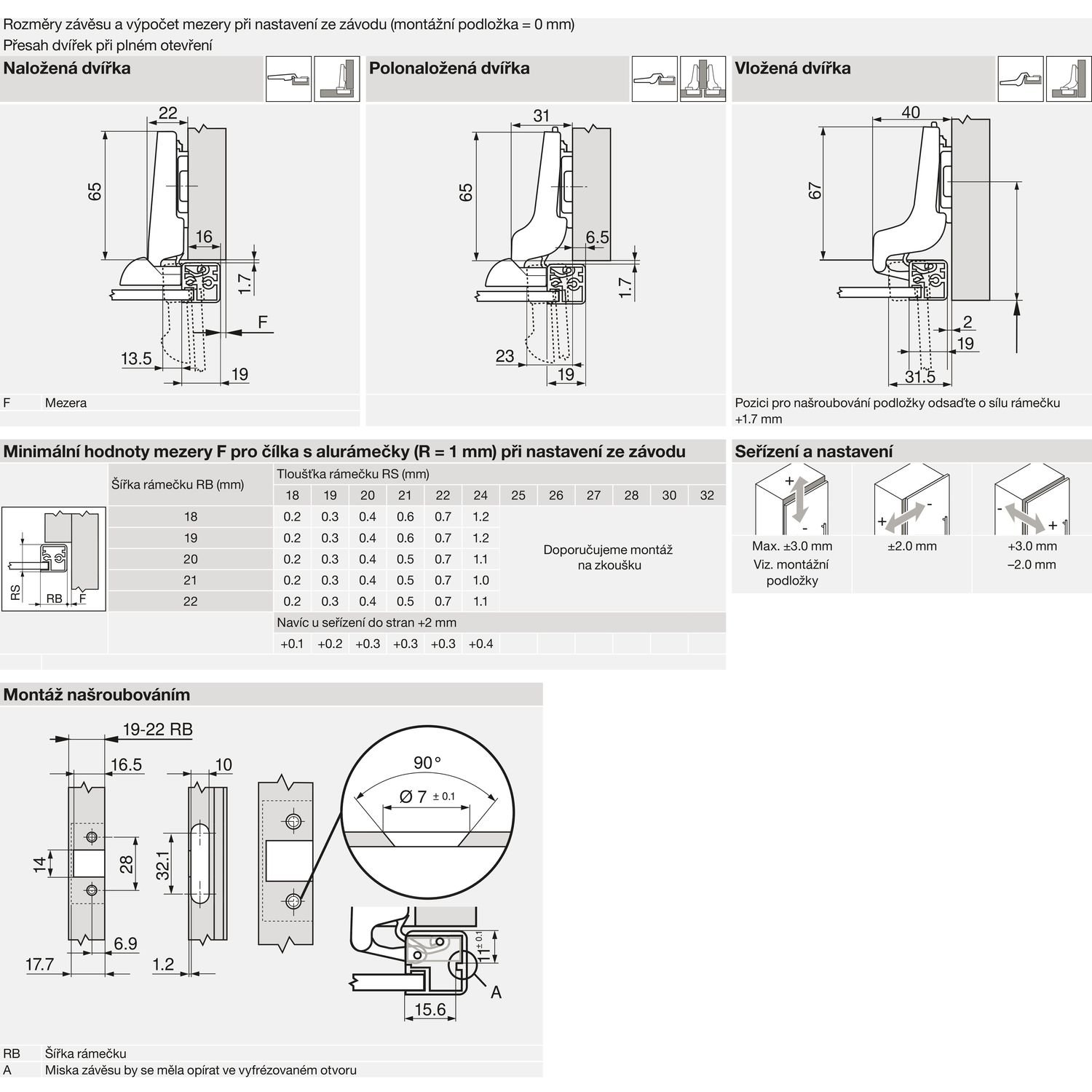 BLUM CLIP top 71T950A naložený závěs pro úzký alurám. 95°, s pružinou, na vrut