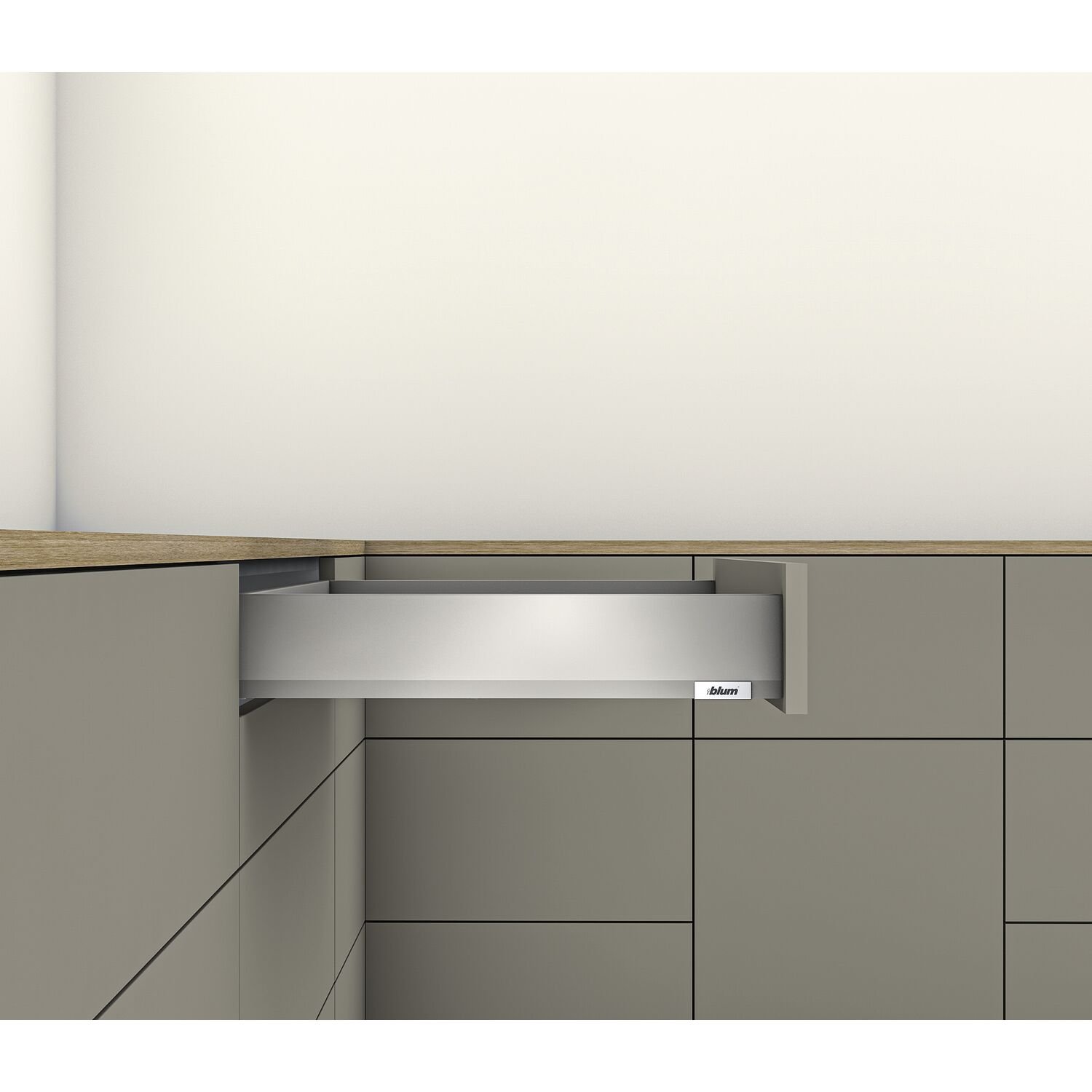 BLUMOTION S - BLUMOTION nebo TIP-ON BLUMOTION integrovaný v korpusové vodicí liště. Připevněním jednotky pro otvírání TIP-ON BLUMOTION se tlumení automaticky přizpůsobí.