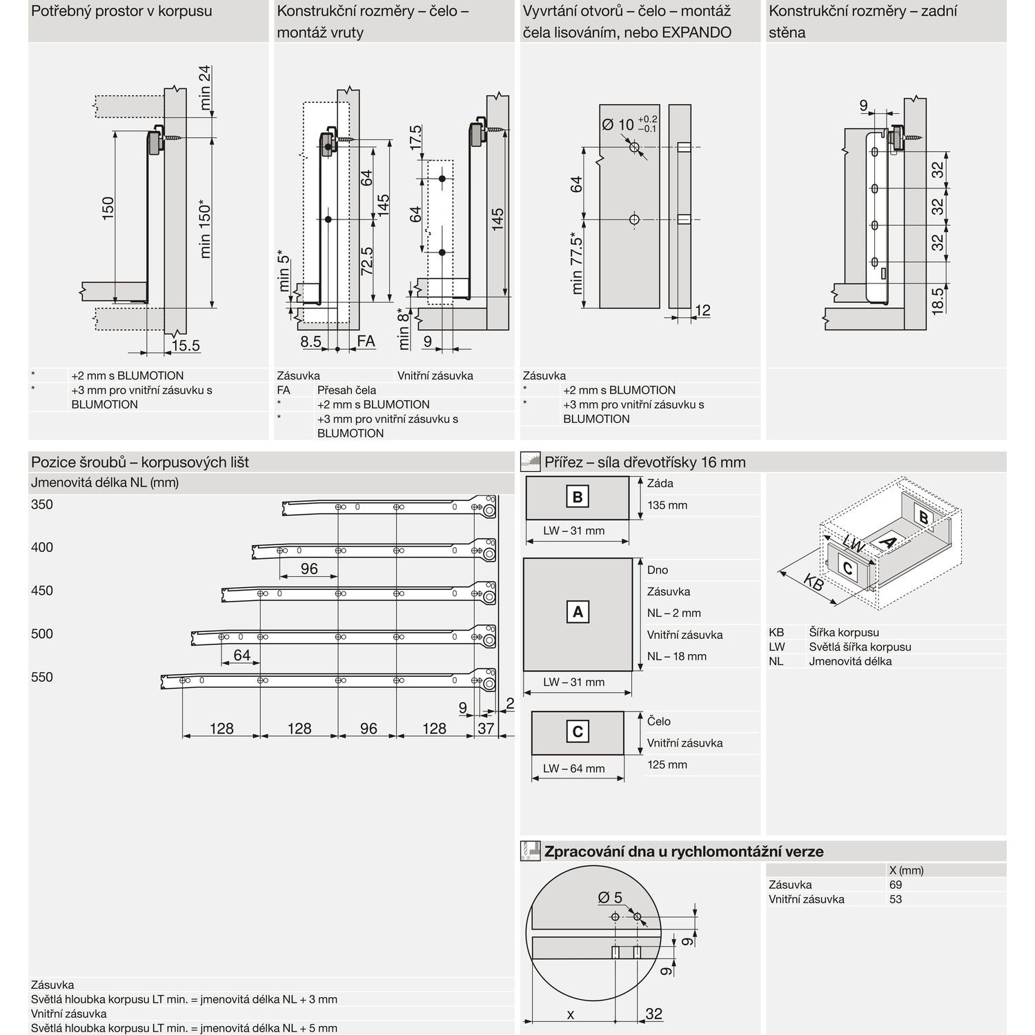 BLUM METABOX H, 320H3500C částečný výsuv, délka 350 mm, pro vrut, krémově bílá Typ: METABOX 320 H Výrobní číslo: 320H3500C Provedení: pro vrut Dráha výsuvu: částečný výsuv Ztráta výsuvu (mm): 67 Jmenovitá délka (mm): 350 Výška bočnice (mm): 150 Nosnost (kg): 25 Materiál: ocel krémově bílá Rozsah dodávky: Korpusové lišty a bočnice levé/pravé