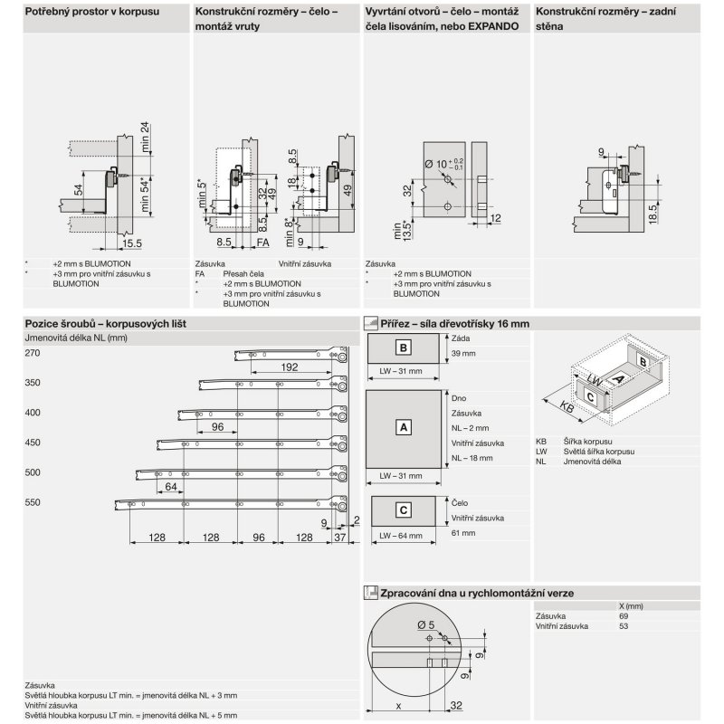 BLUM METABOX N, 320N3500C částečný výsuv, délka 350 mm, pro vrut, krémově bílá Typ: METABOX 320 N Výrobní číslo: 320N3500C Provedení: pro vrut Dráha výsuvu: částečný výsuv Ztráta výsuvu (mm): 85 Jmenovitá délka (mm): 350 Výška bočnice (mm): 54 Nosnost (kg): 25 Materiál: ocel krémově bílá Rozsah dodávky: Korpusové lišty a bočnice levé/pravé