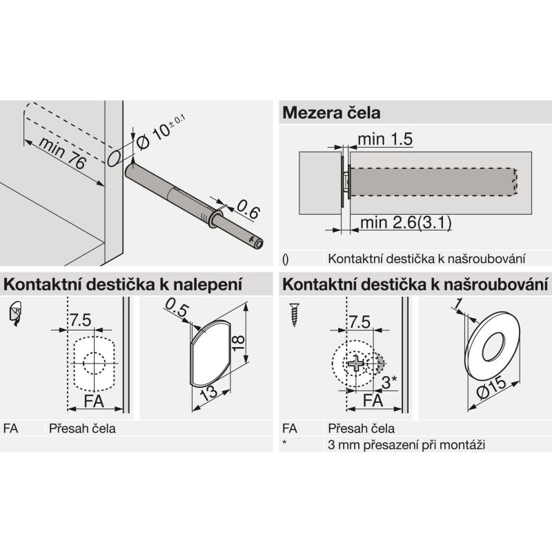 TIP-ON Pro dvířka 956A1006Způsob připevnění: K zavrtání, na straně úchytky Kudy ke spuštění dochází : 1.5 mmMateriál: PlastBarva/povrch: Hedvábně bílé