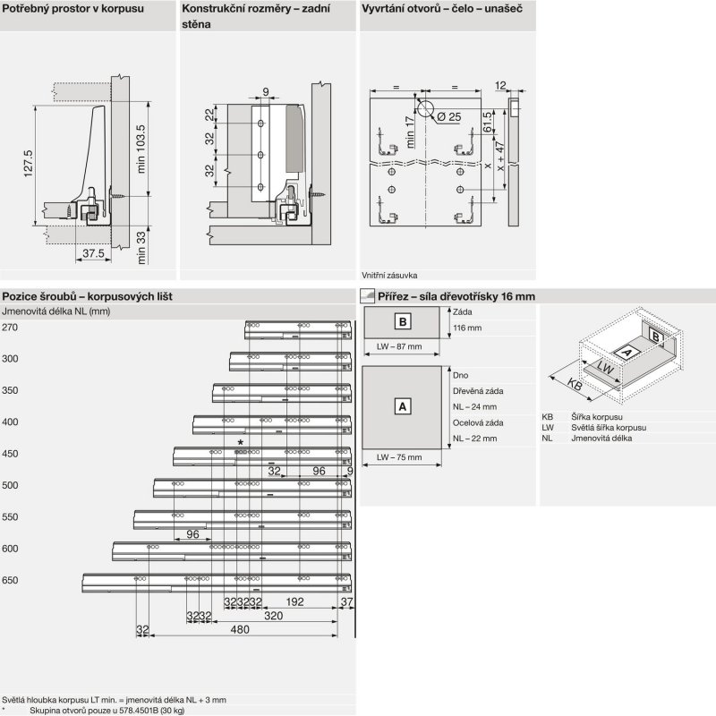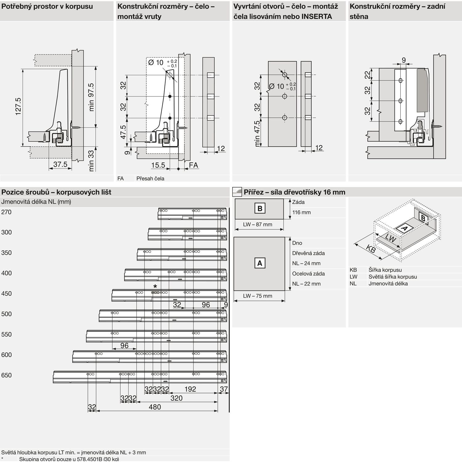 • min. světlá hloubka korpusu = jmenovitá délka NL + 3 mm