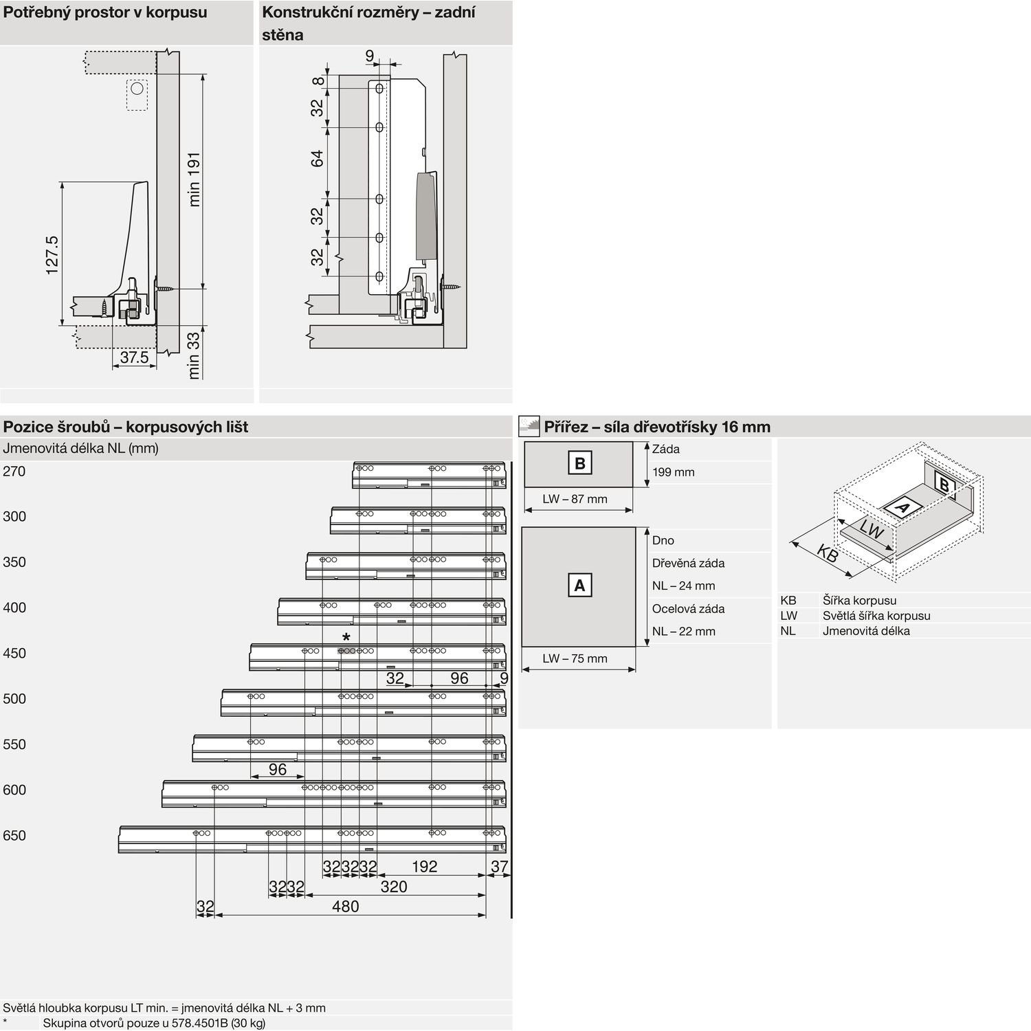 • min. světlá hloubka korpusu = jmenovitá délka NL + 3 mm