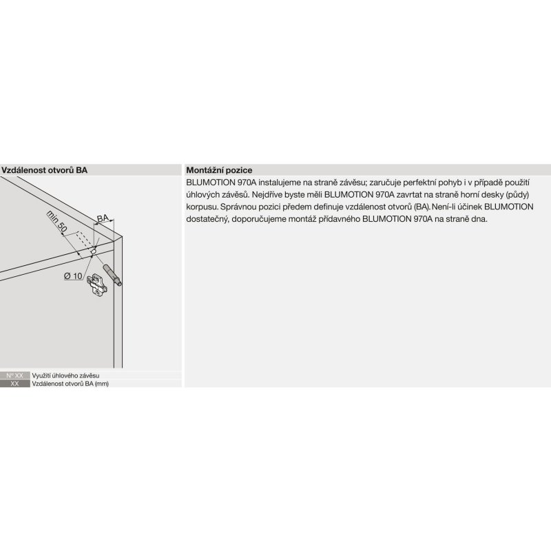 BLUM BLUMOTION 970A1002 tlumicí píst tvrdý, na stranu závěsů, vrtání o10 Typ: BLUMOTION 970A Výrobní číslo: 970A1002 Vrták o (mm): 10 Způsob montáže: k zavrtání, na straně závěsů Materiál: plast Povrch: prachově šedý RAL 7037 jakožto adaptivní systém se přizpůsobí rychlosti zavírání i hmotnosti čílek k dostání v rozličných provedeních pro bezmála každou konstrukční situaci montáž je možná v libovolnou dobu výrobního procesu i odbytu integrovaná pojistka proti přetížení chrání systém před poškozením z důvodu nesprávné a neodborné obsluhy Montážní poloha: BLUMOTION 970A k zavrtání, na straně závěsů správná pozici předem definuje vzdálenost otvorů (BA) k zavrtání nebo v kombinaci s adaptérem není-li účinek BLUMOTION dostatečný, doporučujeme montáž přídavnéhoBLUMOTION na straně dna