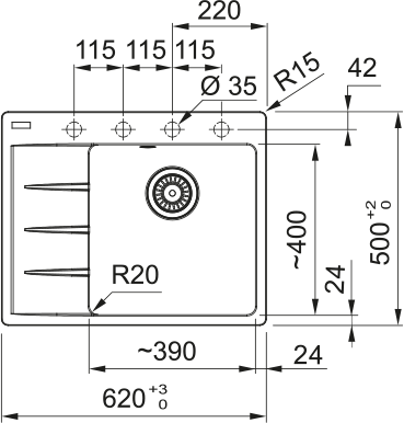 Fragranitový dřez Centro. Cena zahrnuje: Vymezovací podložku pro montáž kuchyňské baterie. Sítkový ventil 3 1/2“ s přepadem. Sifon pro úsporu místa 6/4 “ s odbočkou na myčku nádobí. 4 Místa pro vyvrtání otvoru. Možnost umístit dávkovač saponátu. Fixační příchytky Fast-Fix. Moderní linie, jemně zaoblené hrany, k okraji mizející drážky, tenký profil. Svěží a atraktivní design.