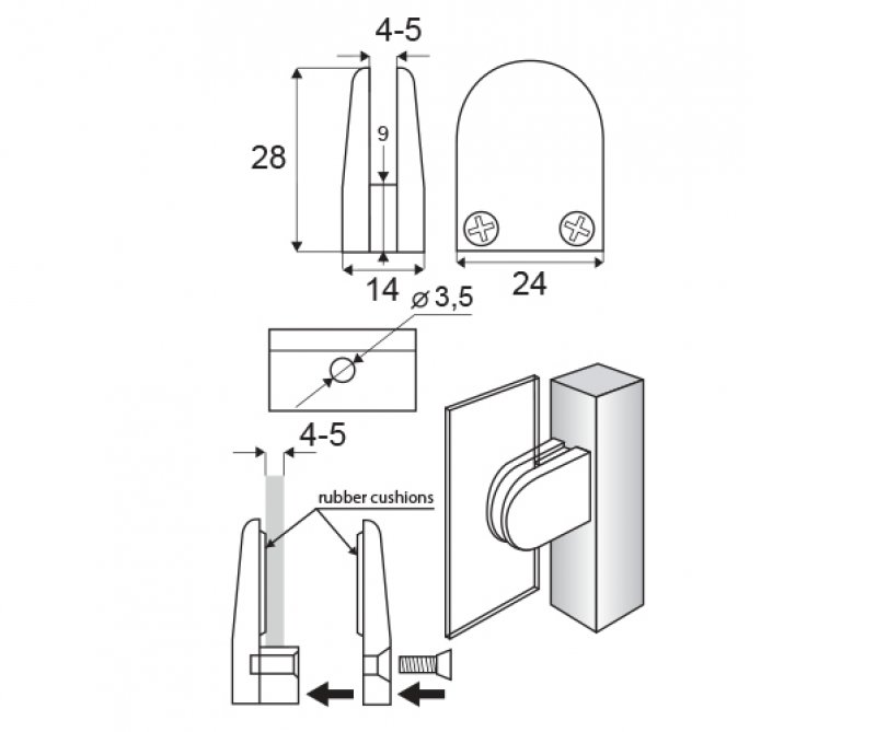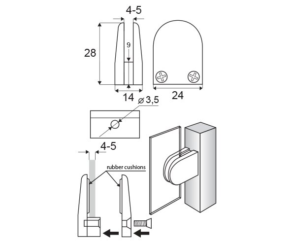 Držák skleněných tabulí je určen pro balkóny, zábradlí a police v interiérech s uchycením pro rovné sloupky.tloušťka skla 4-5mm
