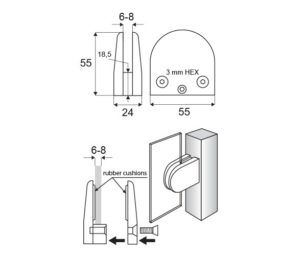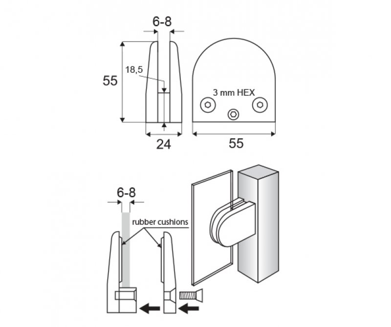 Držák skleněných tabulí je určen pro balkóny, zábradlí a police v interiérech s uchycením tloušťka skla 6-8mm