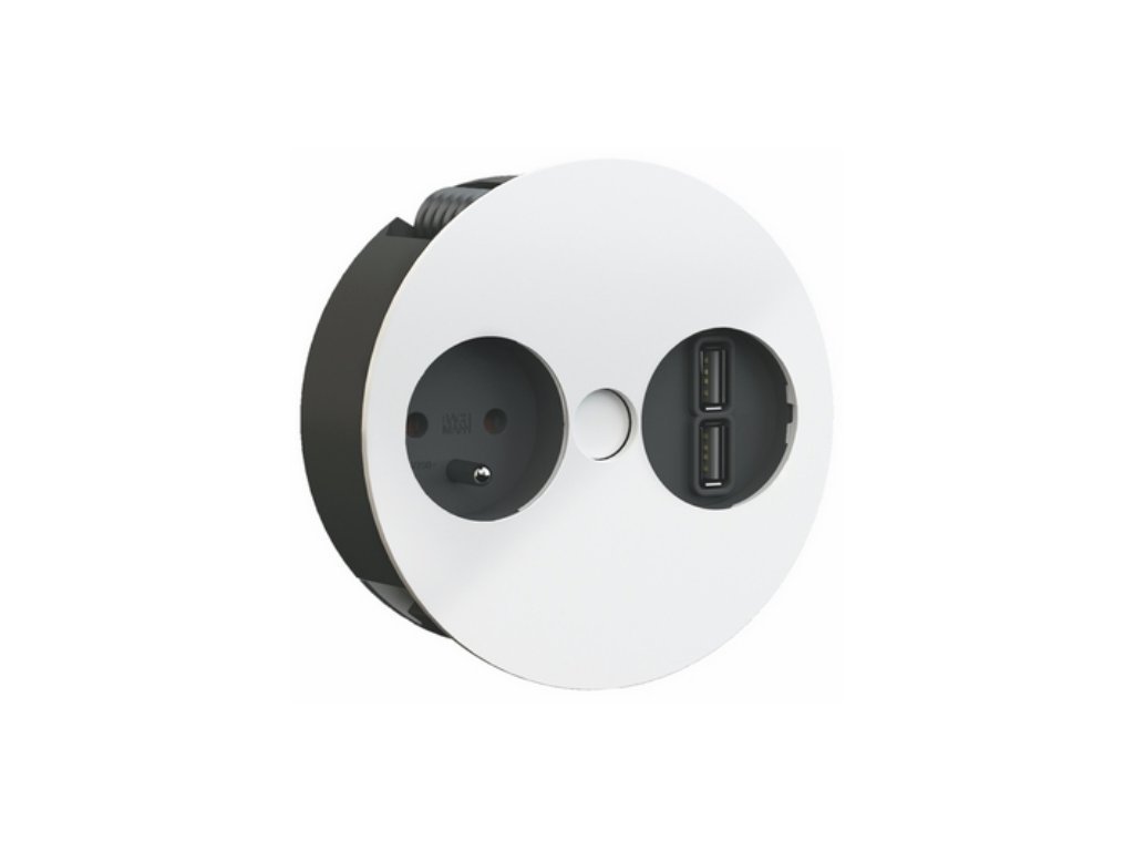 Vrchní krycí část je z nerezové oceli. Po stlačení středu a otočení krytu dojde k odkrytí dvou USB nabijecích portů a jedné zásuvky 230V, naopak při nepoužívání zásuvky ji jednoduše zakryjete a tím pádem neruší design pracovní plochy.