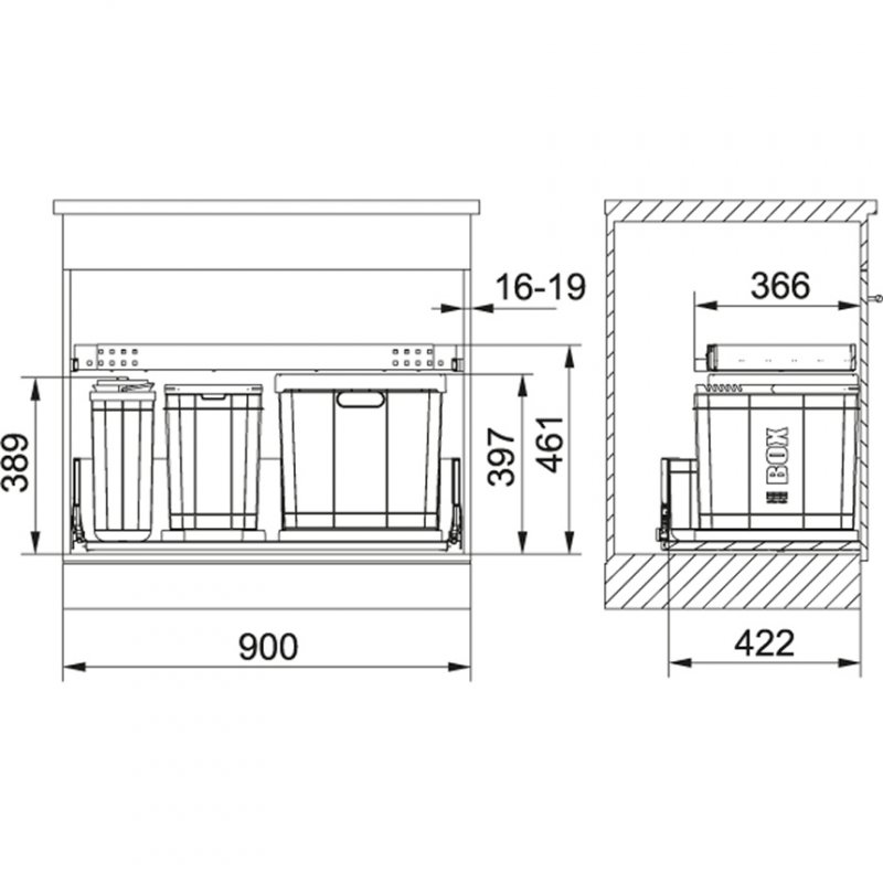 Koš se vkládá do zásuvky s plnovýsuvem, která je osazena podélným relingem nebo vysokou bočnicí.