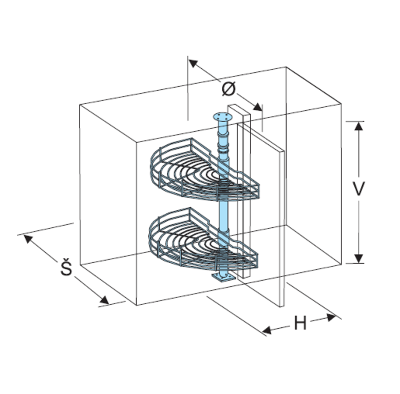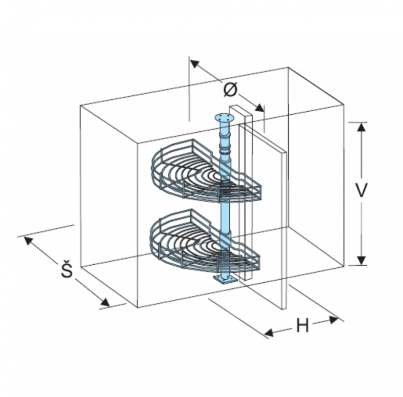 Materiál: ocel Povrchová úprava: chrom Maximální zatížení: 10 kg Složení setu: • 2× otočný drátěný koš • 1× nosná tyč • 1× plastový háček na dvířka • montážní set Montáž: do boku a dna korpusu Minimální hloubka korpusu: 500 mm Plastový háček na dvířka spolu s otevíráním dvířek otáčí košem karuselu.