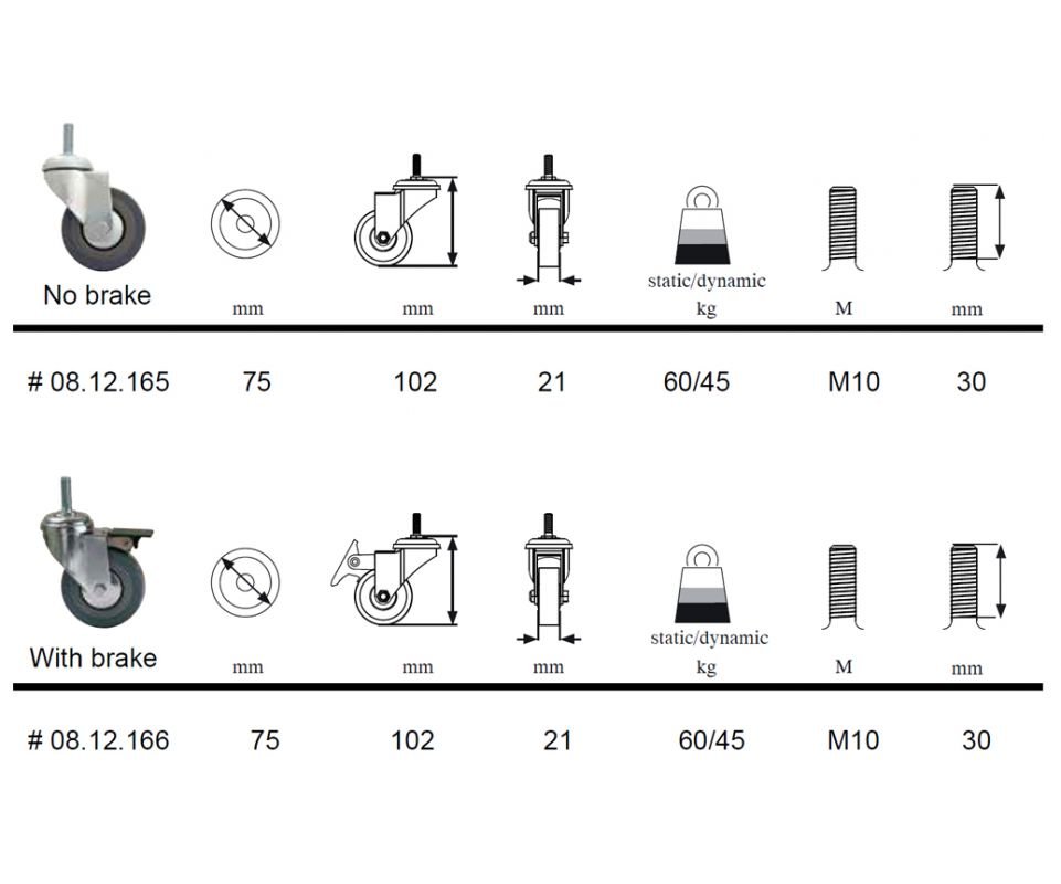 kolečko zátěžové otočné 75 mm se šroubem M10x30mm