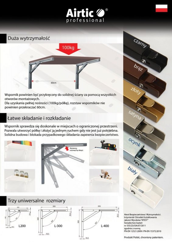 K dispozici jsou dvě délky ramen: 300 mm a 400 mm a povrchová úprava prášková barva bíla a hnědá. Skládací držák má certifikát bezpečnosti a pevnosti podle PN-EN 12521: 2009 a PN-EN 15372: 2010 Maximální nosnost stolu se dvěma držáky rozmístěnými 600 mm od sebe je 100 kg. K získání tohoto parametru únosnosti je nutné připevnit konzolu L400 ke zdi ve 4 bodech a konzolu L300 ve 3 bodech, vždy pomocí jednoho z kruhových otvorů umístěných v horní části montážní lišty ve tvaru písmene U.