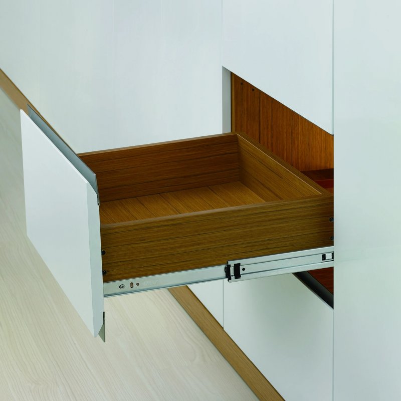 Kuličkový plnovýsuv zinkovaný, určený na bok zásuvky, úplné vysunutí zásuvky, tlumené dovírání. V sadě jsou dva kusy na jednu zásuvku.