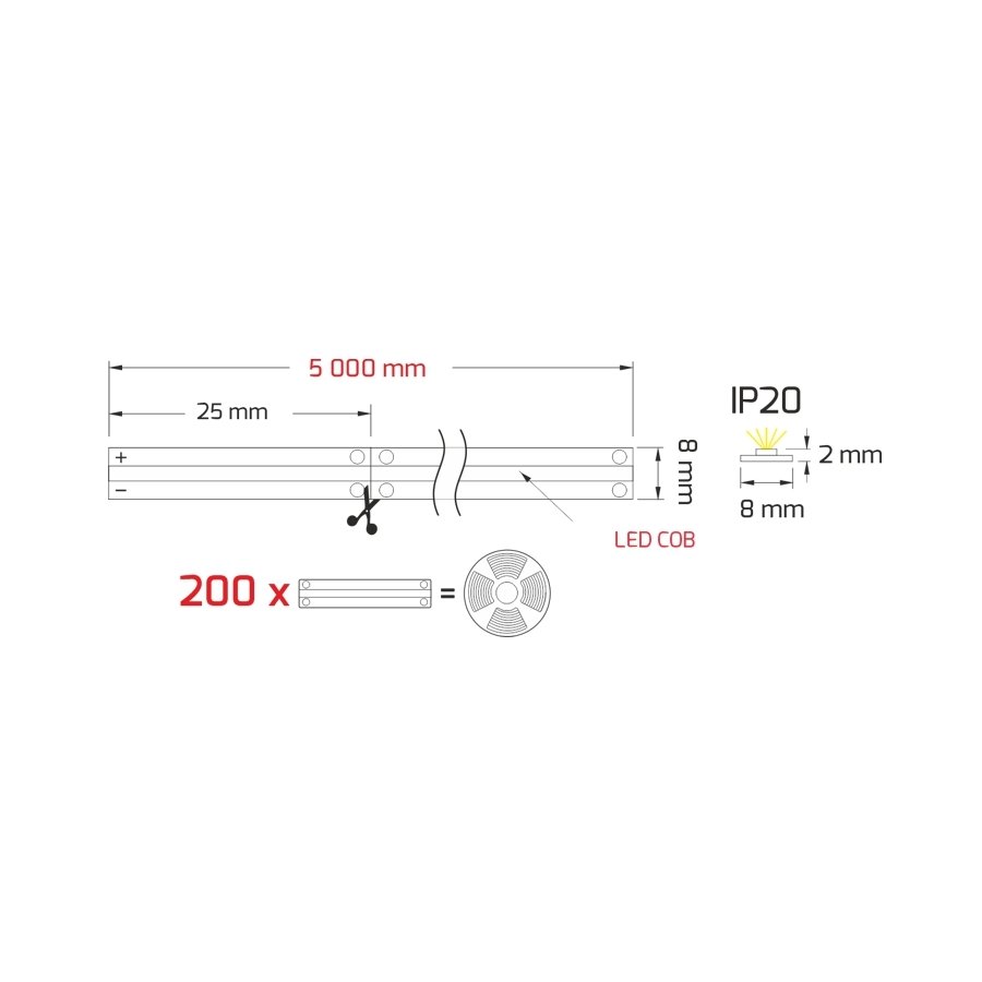 COB LED pásek IP20 Údaje o pásku na 1 m: 480 LED, 12,8W, Teplá bílá 1180 lm, Studená bílá 1260 lm, Neutrální 1220 lm, IP20 COB LED pásek je inovativní řešení, které umožňuje dosáhnout efektu jednotné linie světla bez viditelných diod. Jedná se o pásku osazenou moderními COB (Chip on Board) diodami. V případě COB diod je snadné získat vysoký výkon a vysoký světelný tok. Páska COB se vyznačuje zvýšenou odolností a nižší spotřebou energie než její protějšek technologie SMD. Lze jej použít jako funkční i dekorativní osvětlení. Délka role pásky je 5 m, šířka je 8 mm, její výkon je 12,8W/1m. Světelný tok pro jednotlivé barvy světla je: Teplá bílá 1180 lm/1 m; Studená bílá 1260 lm/1 m; Neutrál 1220 lm/1 m. Pásku lze stříhat každých 25 mm v místech vyznačených na pásce na libovolně dlouhé úseky. Páska je k dispozici ve třech světlých barvách: teplá bílá studená bílá neutrální bílá