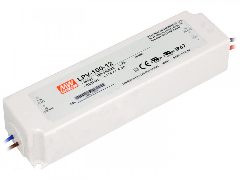 Druh zdroje: AC/DC Provedení: Zdroje pro LED Série: LPV Vstup: 90~264V AC, 127~370V DC Výstup: 12V 0~8,5A Výkon: 102W Rozměry: 190x52x37mm