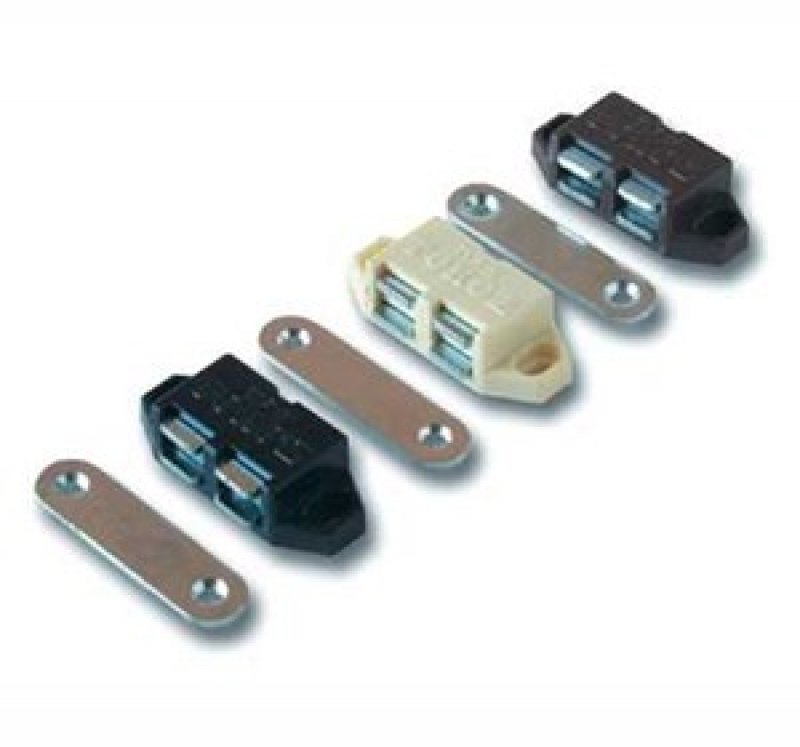 Magnetická sklapka - černá • skládá se z feritového magnetu, ocelových pólových nástavců, skříňky z plastické hmoty • určena k zabezpečení nábytkových dveří v zavřené poloze • svojí konstrukcí umožňuje seřízení mezery mezi korpusem a dveřmi nábytkových dílců • barevné provedení • kvalita TOKOZ - stabilní přidržovací síla