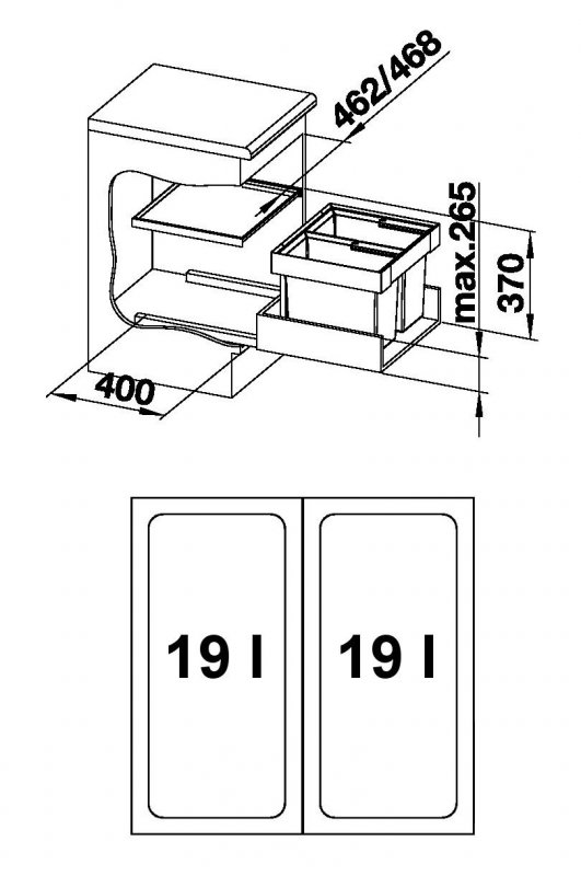 Výška zabudování 355 mm nad dnem zásuvky, hloubka zabudování 400 mm.