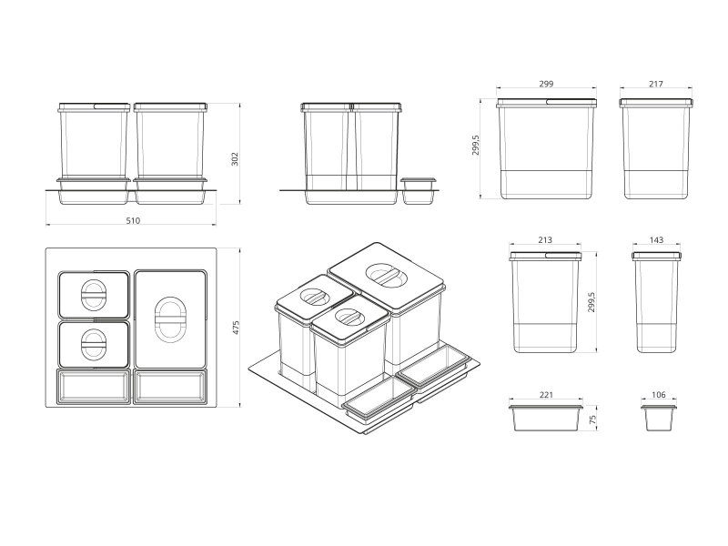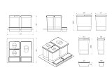 Odpadkový koš do šuplíku 600, 1x15 l + 2x7 l, šedý plast