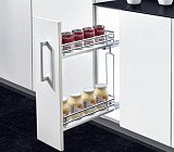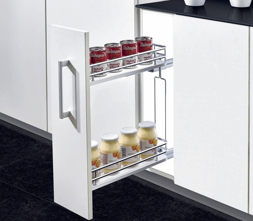 Materiál: ocel Povrchová úprava: chrom Maximální zatížení: 30 kg Složení setu: • 1× dvojkoš s plným dnem • 2× držák čela • 2× plnovýsuv s tlumeným dovřením • montážní set Montáž: do boku korpusu Minimální vnitřní hloubka korpusu: 490 mm Boční plnovýsuvný dvojkoš do korpusů 150 a 200 mm poskytuje přehledné uspořádání věcí v úzkých skříňkách s pohodlným přístupem Dveřní kování umožňuje nastavení dvířek ve všech směrech