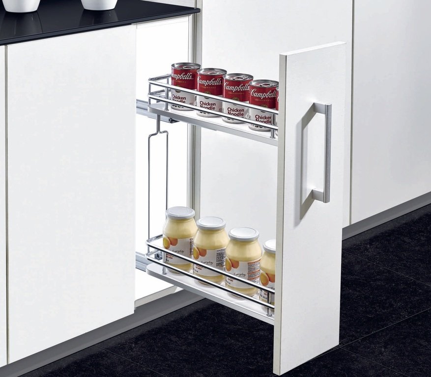 Materiál: ocel Povrchová úprava: chrom Maximální zatížení: 30 kg Složení setu: • 1× dvojkoš s plným dnem • 2× držák čela • 2× plnovýsuv s tlumeným dovřením • montážní set Montáž: do boku korpusu Minimální vnitřní hloubka korpusu: 490 mm Boční plnovýsuvný dvojkoš do korpusů 150 a 200 mm poskytuje přehledné uspořádání věcí v úzkých skříňkách s pohodlným přístupem Dveřní kování umožňuje nastavení dvířek ve všech směrech