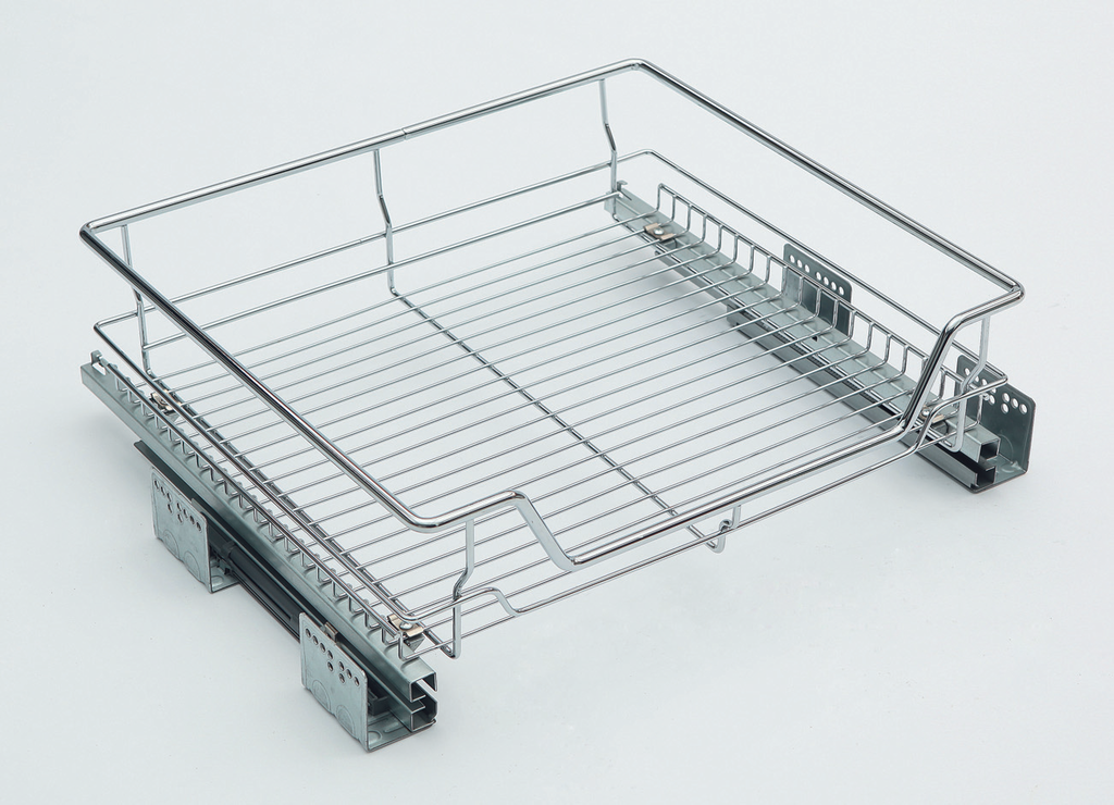 Materiál: ocel Povrchová úprava: chrom Maximální zatížení:30 kg na jeden vnitřní koš Složení setu: • 1× drátěný koš • 2× plnovýsuv WIRELI s tlumeným dovřením • montážní set Montáž: do boků korpusu Uchycení koše: koš je připevněn k výsuvné konstrukci za pomoci šroubků s podložkami, umožňuje rovnoběžné seřízení výsuvů s košem . Minimální vnitřní hloubka korpusu: 490 mm Koš je určen pro montáž bez čelních dvířek i s čelními dvířky .Pro montáž čelních dvířek je potřeba objednat ke koši příslušné úchyty .