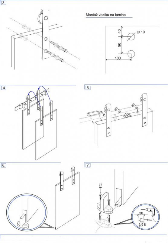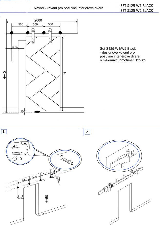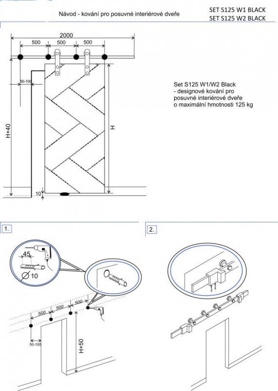 set pro dřevěné dveře, s tlumením, černá plochá tyč, délka 2x1,5m