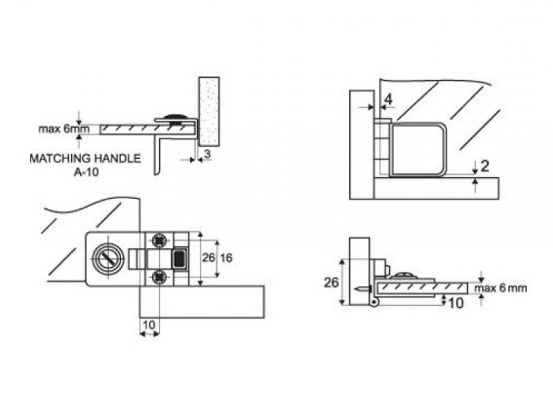 Závěs je určen pro vložené skleněné dvířka bez nutnosti vrtání do skla. Závěs je dodáván v párech (horní a spodní).