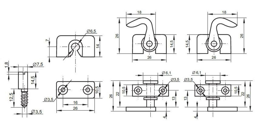 2ks háček s držákem, 2ks kolík pro háček, 2ks vodítko táhla