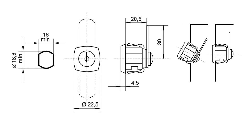 Zámek využívaný k zamykání plechových skříní a zásuvek bez použití převlečné matice.