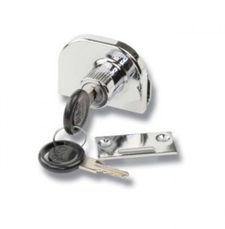 Zámek slouží k uzamykání dvou křídel skleněných dveří do půdy nebo dna korpusu bez nutnosti vrtání otvoru do skla.