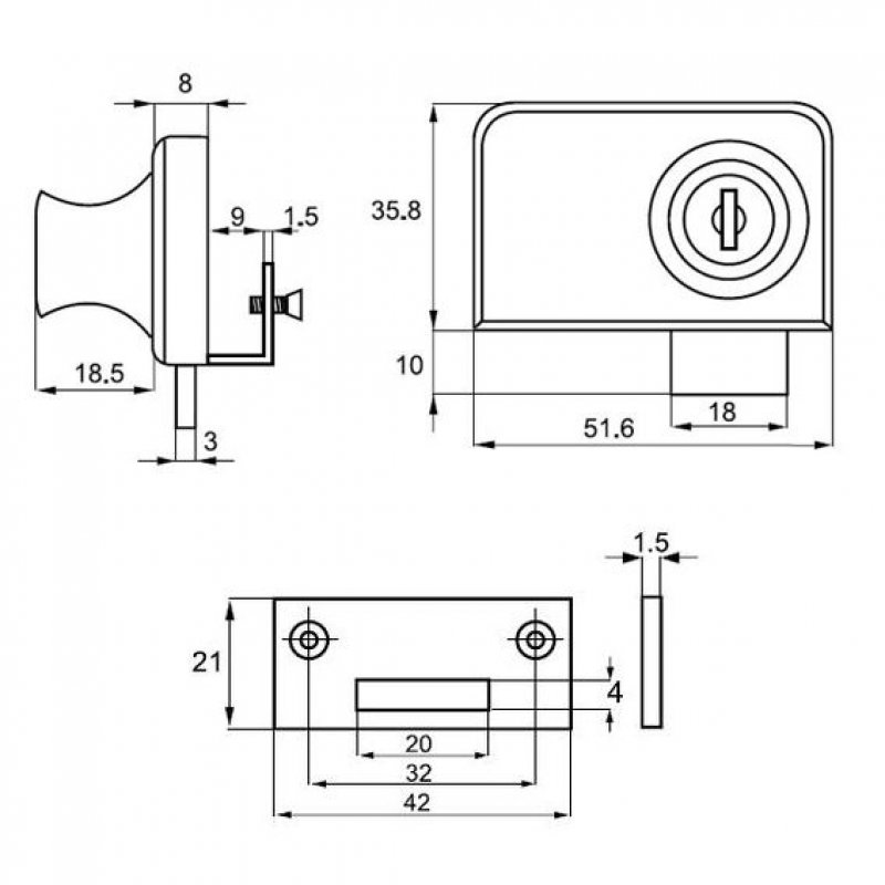 Zámek slouží k uzamykání dvou křídel skleněných dveří bez nutnosti vrtání otvoru do skla.