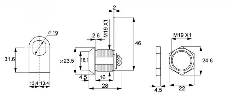 Zámek slouží k uzamykání jednoho skleněného křídla dveří do korpusu. Nutno vrtat otvor do skla.