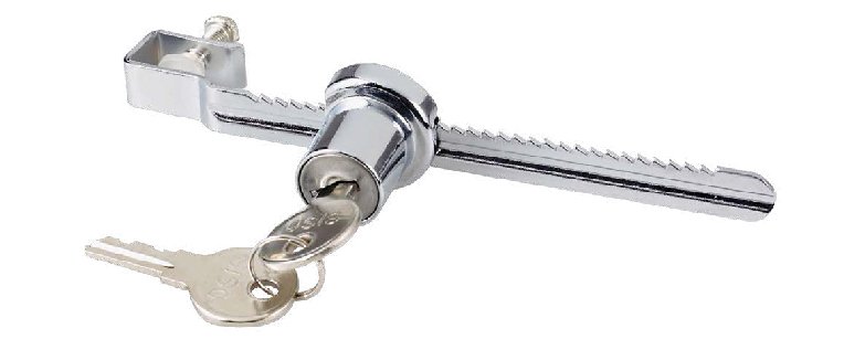 Zámek slouží k uzamykání dvou posuvných skleněných dveří bez nutnosti vrtání otvoru do skla.