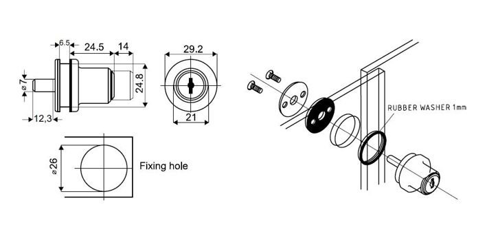 Zámek slouží k uzamykání dvou posuvných skleněných dveří. Nutno vrtat otvor do předních dveří.