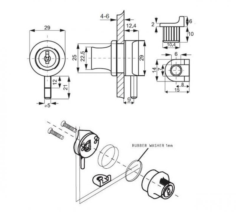 Zámek slouží k uzamykání jednoho křídla skleněných dveří do půdy nebo dna korpusu. Nutno vrtat otvor do skla.