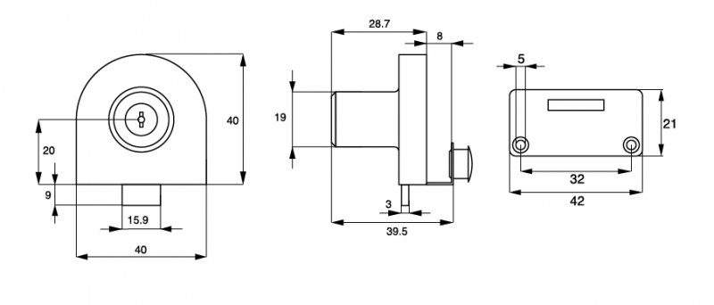 Zámek slouží k uzamykání jednoho křídla skleněných dveří do půdy nebo dna  korpusu bez nutnosti vrtání otvoru do skla.