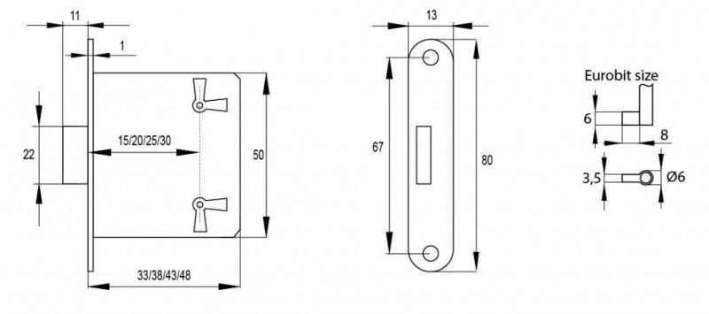 Pravolevý zámek s nutností zadlabání do čela dvířek. Klíčová dírka je vzdálená od čela 25mm. Klíče nejsou součástí balení, možnost objenání v sekci Doplňky, díly a příslušenství.