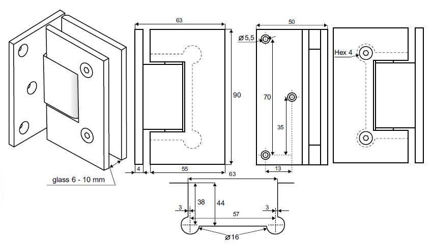tloušťka skla 6-10mm, max. šířka dveří 800mm, zatížení 18kg/závěs, otvírání dveří 90° |