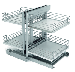 Materiál: ocel Povrchová úprava: koše: chrom / chrom – lamino nosné rámy: šedý epoxid Maximální zatížení: 5 kg na každý koš Složení setu: • 1× nosný rám horizontální • 1× nosný rám vertikální • 4× koš (drátěný nebo s plným dnem) • 1× montážní set Montáž: do dna korpusu Minimální hloubka korpusu: 800 mm Minimální vnější hloubka korpusu: 550 mm Minimální šířka dvířek: 400 mm Provedení: instalace do levé nebo pravé rohové skříňky Drátěné koše nebo koše s plnými dny (lamino). Tlumený dotah výsuvů.