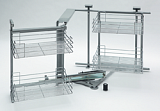 Materiál: ocel Povrchová úprava: koše: chrom / chrom – lamino nosné rámy: šedý epoxid Maximální zatížení: 5 kg na každý koš Složení setu: • 1× posuvný nosný rám • 1× nosný rám s výsuvným mechanizmem a kapalinovým pístem • 4× koš (drátěný nebo s plným dnem) • 1× montážní set Montáž: do dna, zad a boku korpusu Minimální vnější šířka korpusu: 900 mm Minimální vnitřní hloubka korpusu: 500 mm Minimální šířka otvoru dvířek: 450 mm Provedení: instalace do levé nebo pravé rohové skříňky Drátěné koše nebo koše s plnými dny (lamino). Tlumený dotah výsuvů.