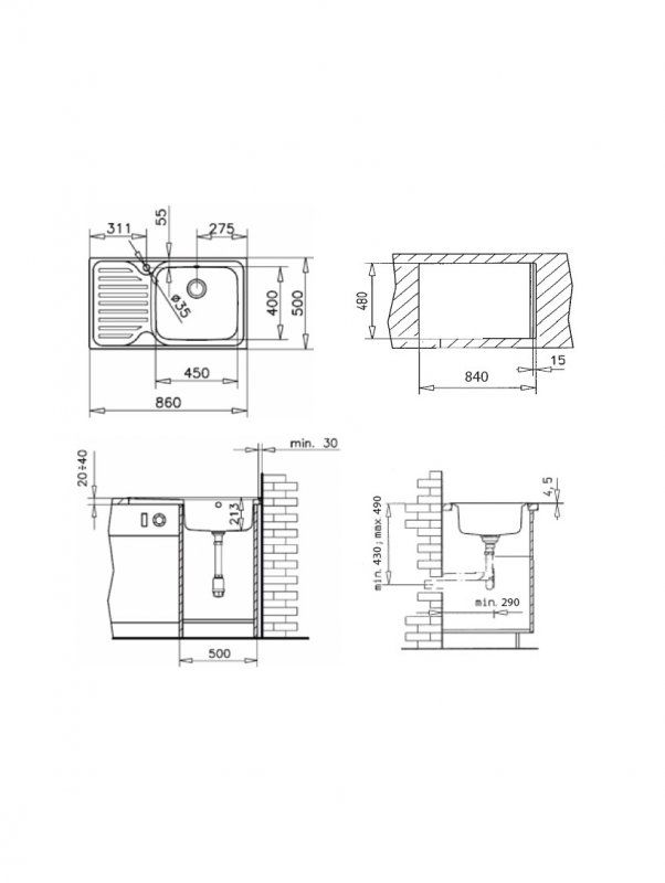 Vnější rozměr: 860x500 mm, výřez: 840x480 mm, rozměr vaničky: 450x400/213 mm