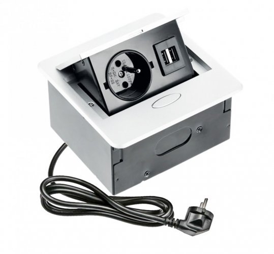 Zásuvkový výklopný blok malých rozměrů s povrchem desky z hliníku umožňuje schovat zásuvky a kabely pod desku stolu. Díky tomu je snadný přístup ke konektorům, ale zároveň je to dobré zabezpečení, pokud jsou přítomny malé děti. Výrobek má jednu zásuvku typu E (french - česká) s maximálním příkonem 3500W / 16A a dva USB konektory typu A ( 5V/2A) pro nabíjení telefonů, tabletů a dalších elektronických zařízení. Tento moderní zásuvkový blok v bílé barvě skvěle zapadne do pracovní desky ve Vaší kuchyni, ale hodí se i do kancelářských či konferenčních prostor.
