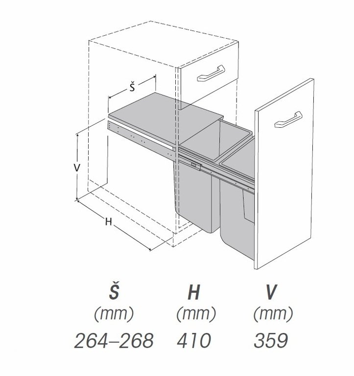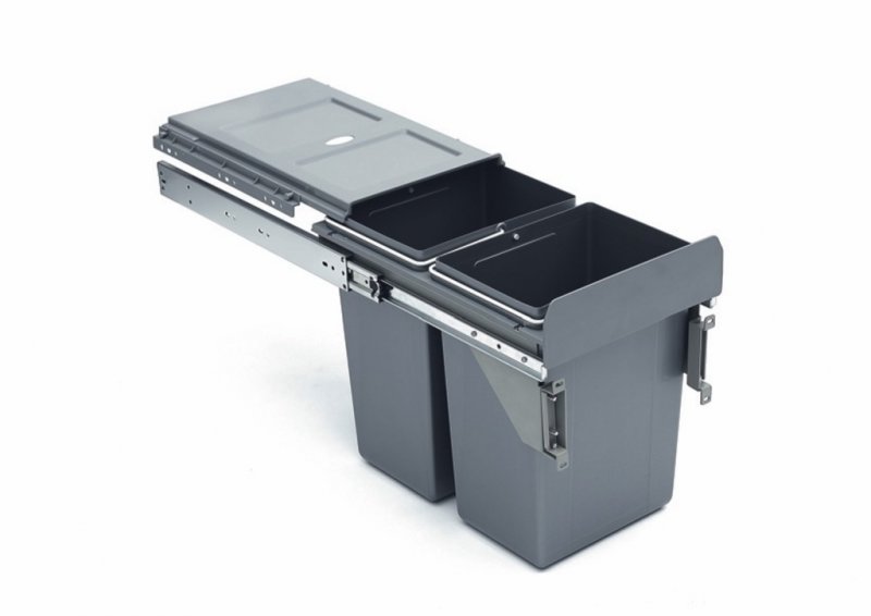 Výsuvný odpadkový 2-koš s úchyty dvířek, 2x11 l, šedý plast
