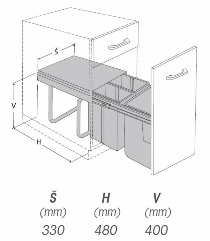 Výsuvný odpadkový 3-koš s úchyty dvířek, 2x10 l+1x20 l, K40-šedý plast